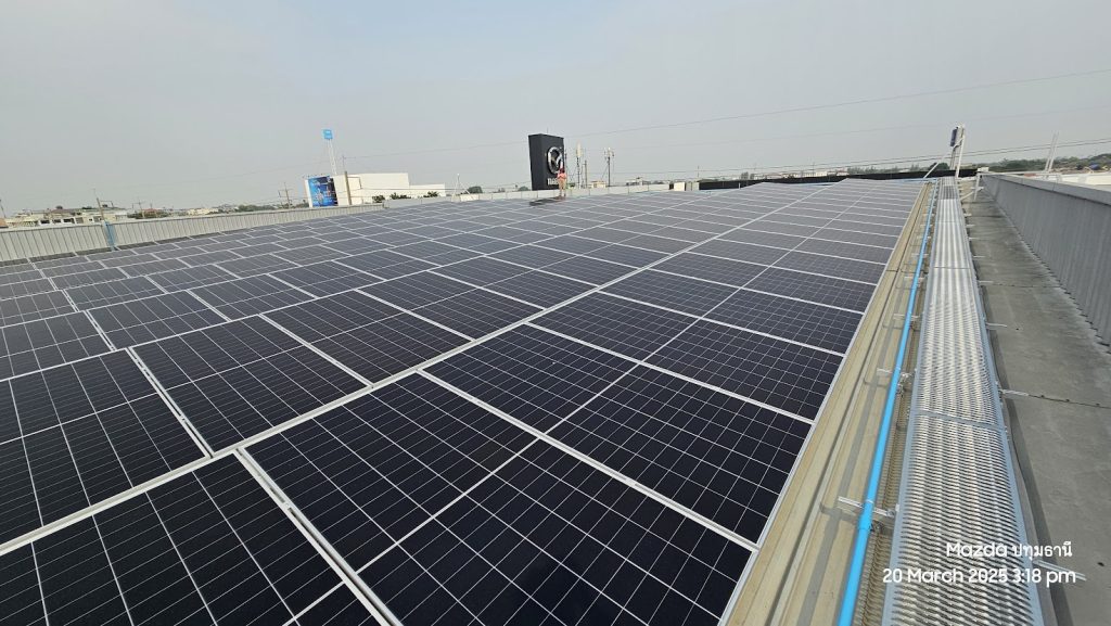 ระบบโซลาร์เซลล์ ณ โครงการ บริษัท ออโต้ แกเลอรี่ จำกัด (Mazda ปทุมธานี) ติดตั้งไว้รวม 1 อาคาร ขนาดกำลังผลิตของแผงรวม 117kWp ใช้แผงโซล่าเซลล์ AIKO G650 จำนวน 180 แผง ใช้งานร่วมกับอินเวอร์เตอร์ HUAWEI Inverter SUN2000-100KTL รองรับกำลังผลิตสูงสุด 110kW โดยติดตั้งเป็นระบบ On Grid ไม่มีแบตเตอรี่ร่วม คำนึงถึงประสิทธิภาพการทำงาน และความปลอดภัยของระบบเป็นจุดสำคัญ