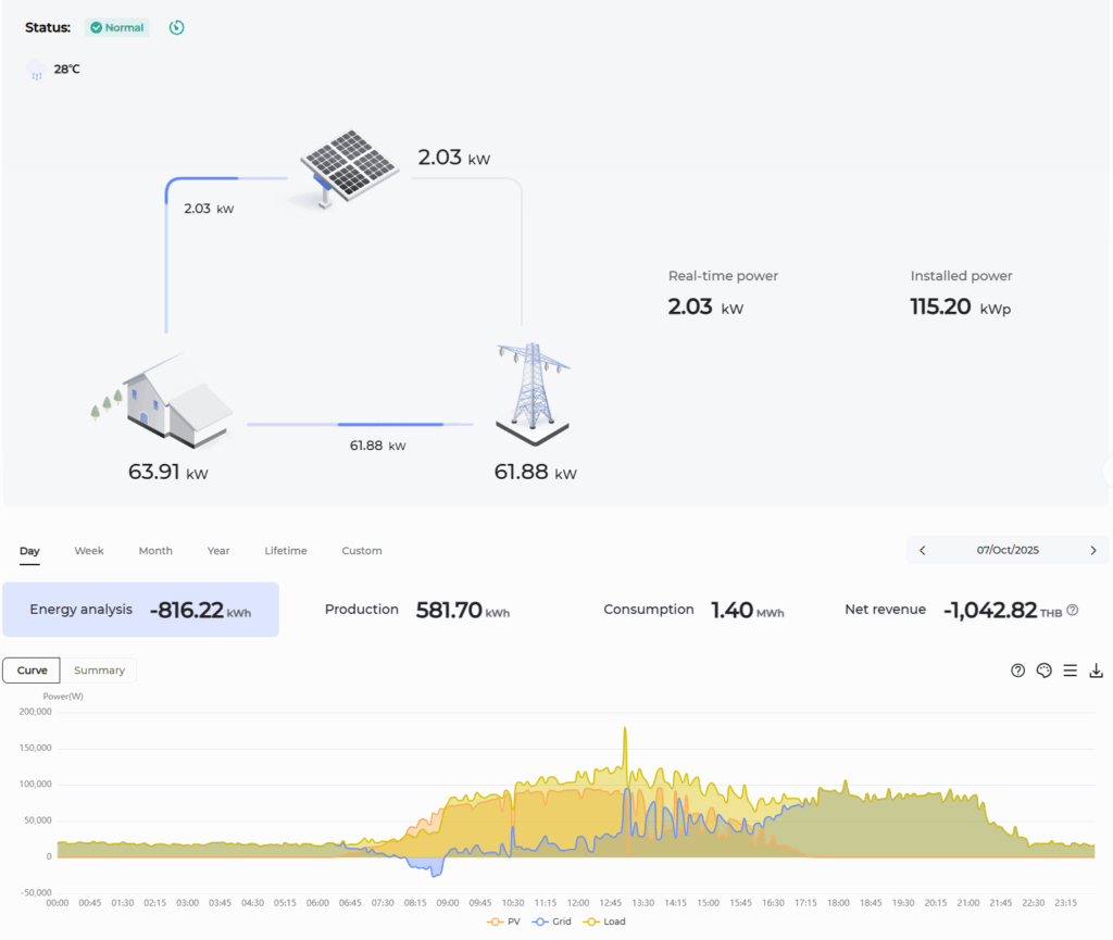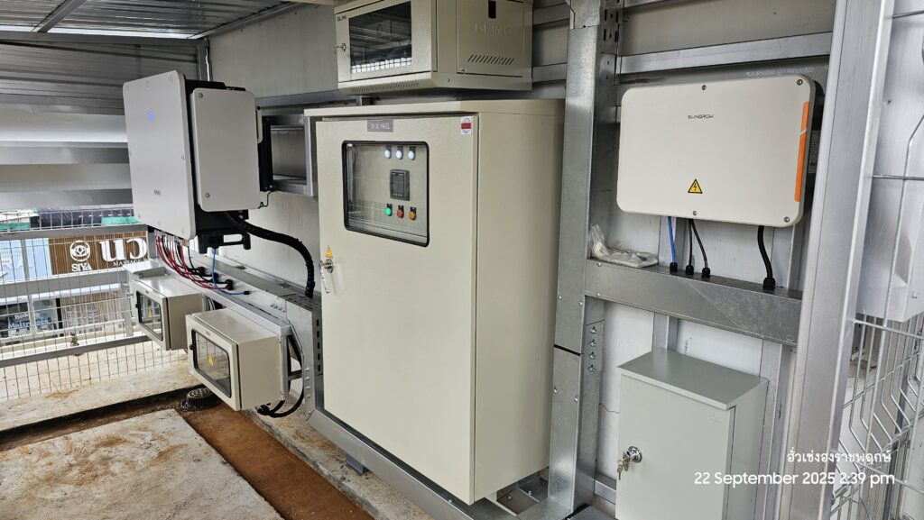 โดยติดตั้งเป็นระบบ On Grid ไม่มีแบตเตอรี่ร่วม พร้อมระบบ Arc fault และ Zero Export โดยมาตรฐานการติดตั้งเป็นไปตามข้อกำหนดทาง วสท. (วิศวกรรมสถานแห่งประเทศไทย) โดยคำนึงถึงประสิทธิภาพการทำงาน และความปลอดภัยของระบบเป็นจุดสำคัญ มีการออกแบบห้องตั้งอินเวอร์เตอร์นอกอาคาร ราวจับและรั้วโดยรอบพื้นที่ติดตั้งแผง ติดตั้งแผงทั้งบนอาคาร และหลังคาลานจอดรถ