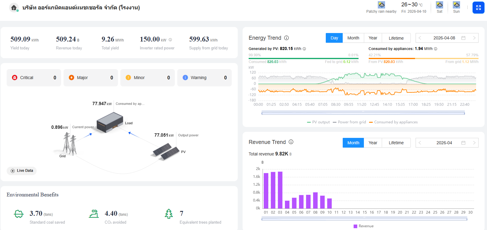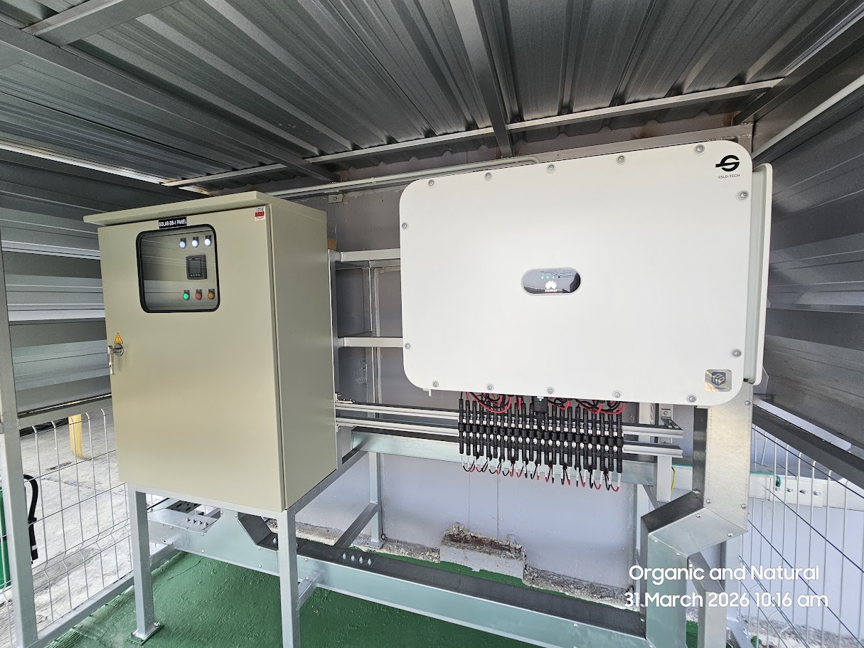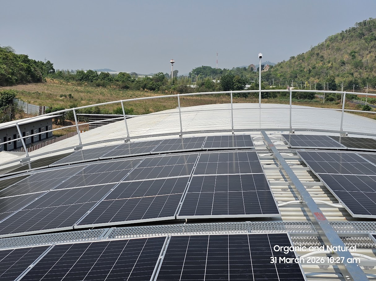 ระบบโซลาร์เซลล์ โครงการ บริษัท ออร์แกนิค แอนด์ แนชเชอรัล จำกัด ขนาดกำลังผลิตของแผงรวม 292.50kWp จำนวน 450 แผง ใช้แผง AIKO-G-MCH72Dw 650W และ Inverter ของ Huawei รุ่น SUN2000-50KTL-M3 จำนวน 2 เครื่อง และ SUN5000-150K-MG0 1 เครื่อง โดยติดตั้งเป็นระบบ On Grid ไม่มีแบตเตอรี่ร่วม พร้อมอุปกรณ์ Power optimizer รุ่น MERC-1300W-P มีคุณสมบัติสามารถ ตรวจสอบความผิดพลาดของระบบผลิตไฟฟ้า ได้ในระดับแผง